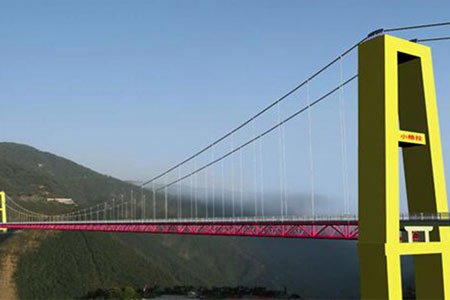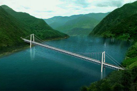 黃登水電站庫(kù)區(qū)小格拉吊橋橋梁主跨280m,橋型為加勁梁懸索橋。...