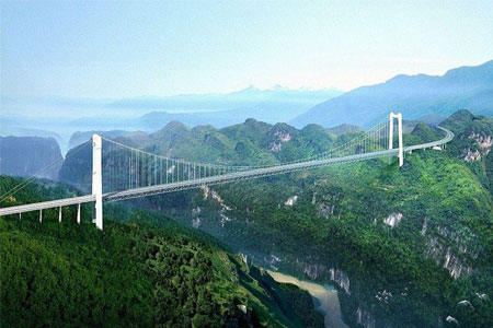 湖南張花高速澧水特大橋,為主跨858米的鋼桁梁懸索橋。...