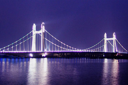 南昌洪都大橋,是單纜單索面雙獨(dú)柱自錨式懸索橋;跨越贛江北支的橋命名為英雄大橋,是...